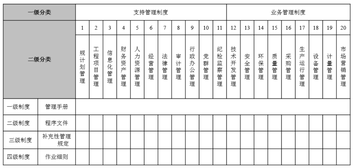 1、建立支撐戰(zhàn)略、符合企業(yè)運營管理特點的制度框架,確保制度建設“橫向到邊,縱向到底”,無盲區(qū)。