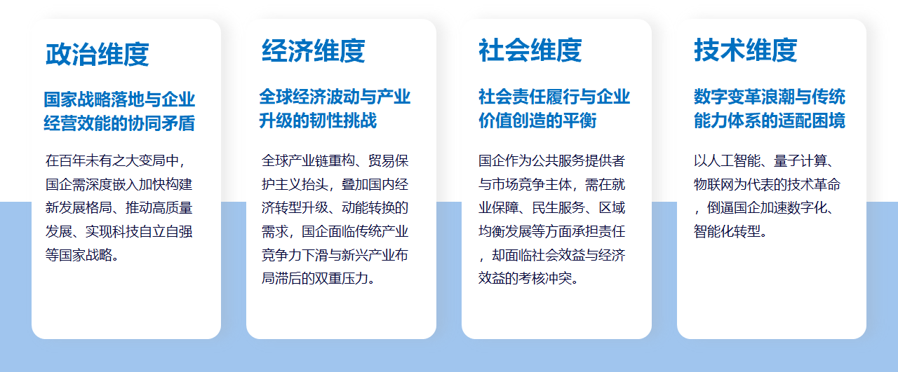 2025年開啟的十五五時期,是我國全面建設社會主義現(xiàn)代化國家的關鍵階段,也是國企深化改革、重塑競爭優(yōu)勢的戰(zhàn)略窗口期。國企作為國民經濟的壓艙石與國家戰(zhàn)略的執(zhí)行者,既承載著鞏固公有制經濟主體地位、服務國家重大戰(zhàn)略的政治使命,又需在全球經濟格局深度調整、科技革命加速演進、社會治理復雜化的背景下,破解多重維度的核心矛盾,實現(xiàn)政治屬性與市場屬性的有機統(tǒng)一。