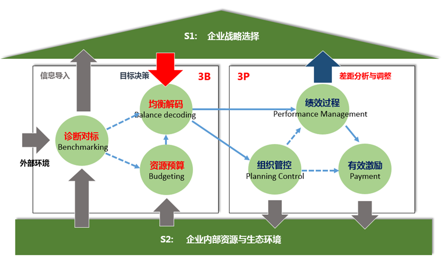 2S+3B+3P,構(gòu)成了一個(gè)全新的戰(zhàn)略規(guī)劃、分解、執(zhí)行、評(píng)估、激勵(lì)的完整閉環(huán),從戰(zhàn)略管理的角度來(lái)看,這是一個(gè)“戰(zhàn)略-組織-執(zhí)行-反饋”的經(jīng)典閉環(huán),從績(jī)效管理的角度,這是一個(gè)“績(jī)效計(jì)劃-績(jī)效過(guò)程-有效激勵(lì)-反饋”的績(jī)效循環(huán),兩者的有機(jī)結(jié)合,成為一種支撐戰(zhàn)略轉(zhuǎn)型的新型管理工具。
