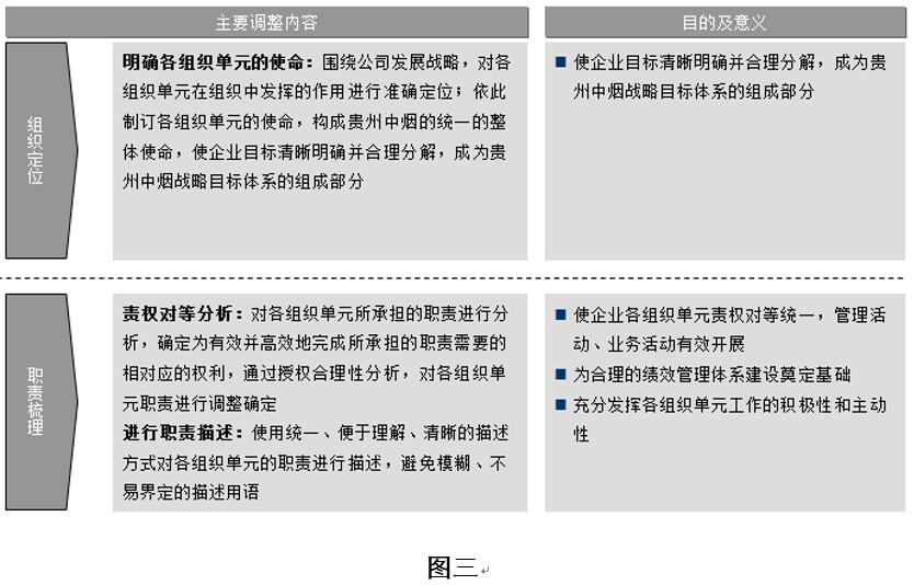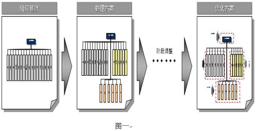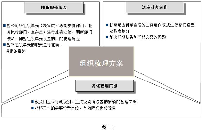 組織結(jié)構(gòu)梳理方案的設(shè)計是在現(xiàn)行組織結(jié)構(gòu)不變的情況下從三項關(guān)鍵內(nèi)容著手:明晰職責體系、適應業(yè)務運作、簡化管理層級。