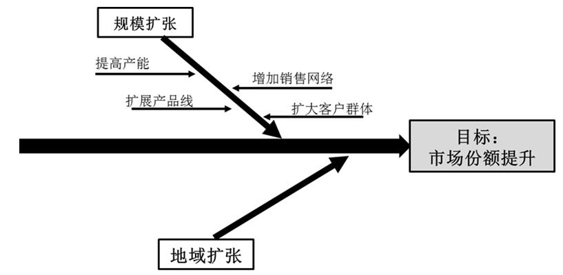 采用魚骨圖描述出各類戰(zhàn)略目標(biāo)實現(xiàn)的可能動因,并逐項分解,由此形成多個可能的戰(zhàn)略路徑,可按下列步驟設(shè)計: