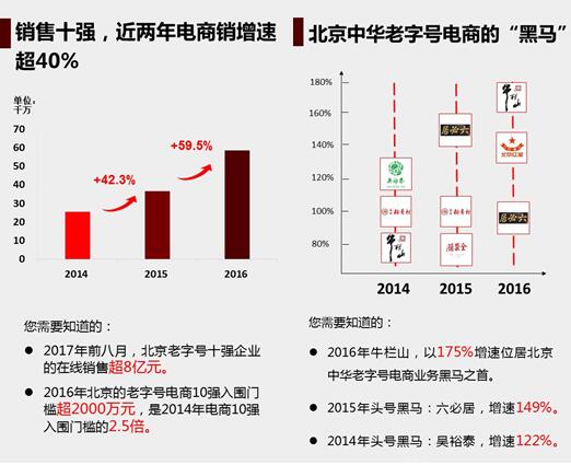 據(jù)研究顯示,全國經(jīng)商務(wù)部認(rèn)證的“中華老字號(hào)”企業(yè)約1200家,超600家通過天貓開展線上銷售。其中,北京市經(jīng)認(rèn)證的“中華老字號(hào)”企業(yè)共117家,超50%老字號(hào)在天貓開展業(yè)務(wù)。2017年前八月,北京老字號(hào)十強(qiáng)企業(yè)的在線銷售超8億元。2016年北京的老字號(hào)電商10強(qiáng)入圍門檻超2000萬元,是2014年電商10強(qiáng)入圍門檻的2.5倍。