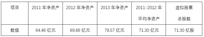 設定本方案實施當年的1月1日為基準日。根據(jù)虛擬合并報表,以基準日之前的三年平均凈資產(chǎn)額,虛構(gòu)股票。如本方案于2014年正式實施,按照虛擬合并報表2011~2013年的平均凈資產(chǎn)額71.30億元,以每股凈資產(chǎn)1元折算,虛擬股票總股數(shù)共計71.30億股。虛擬股票總數(shù)的確定如表3-6所示: