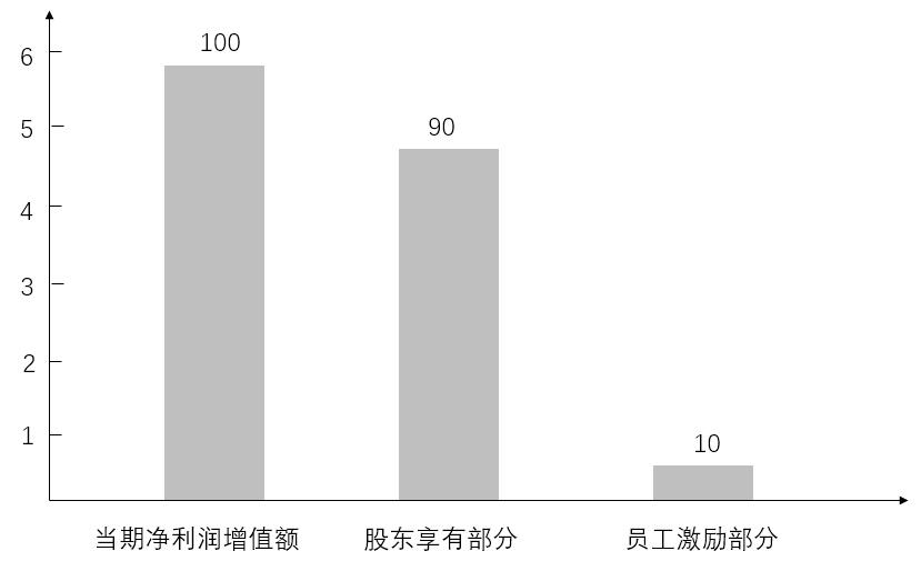 在例二中,當期凈利潤20億元,每股凈利潤為0.2525元,超過標桿線的增值部分為0.0769元。71.3億股總的增值額為5.48億元,其中用于激勵的為增值額的10%,其余增值額的90%歸屬于股東所有。圖示如圖3-1: