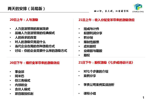 兩天的學習,讓學員對于創(chuàng)新激勵有了全面的了解,掌握了包括組織激勵在內一系列激勵方式和方法,也更加深刻地理解了股權激勵的意義、作用和適用范圍,正本清源,為學員用好、用對這一管理工具打下了良好的基礎。
