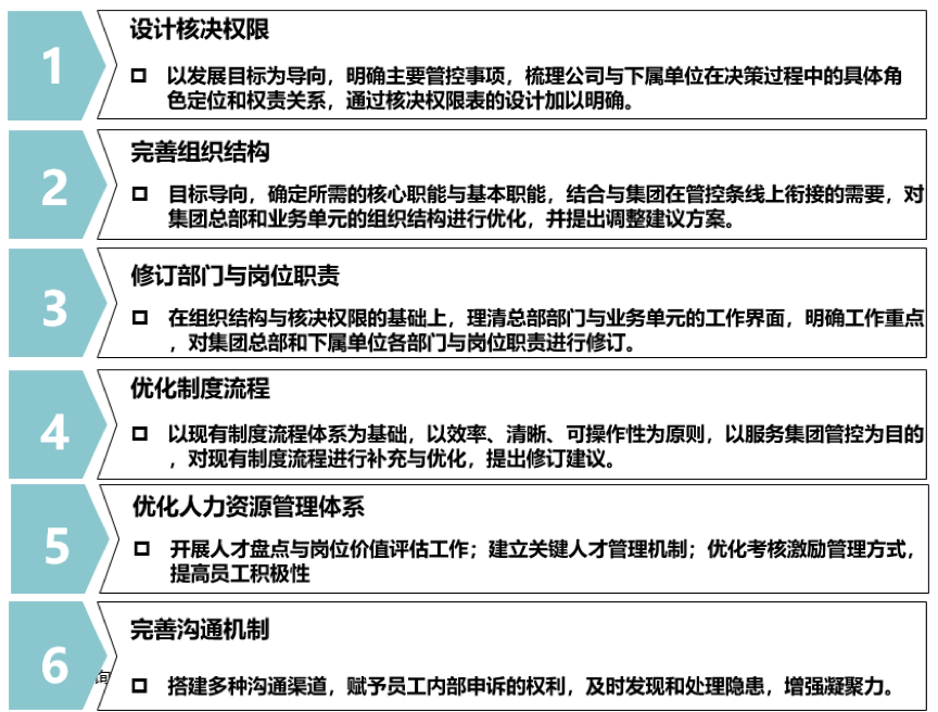 2、組織架構(gòu)變化之后,集團總部對下屬業(yè)務(wù)單元的管控定位和管控權(quán)限尚不明確,對下屬單位各條線的管理缺乏具體的工作指引;