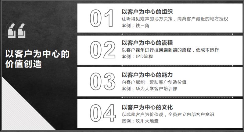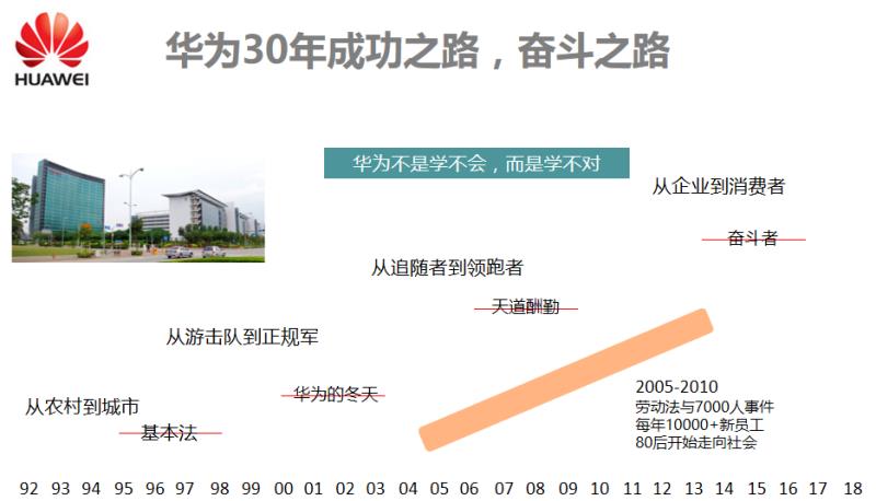 在“成功之路”部分,蘇老師分享了華為在30年間從農(nóng)村到城市、從游擊隊(duì)到正規(guī)軍、從跟隨者到領(lǐng)跑者、從企業(yè)到消費(fèi)者的四次轉(zhuǎn)型,尤其是華為管理實(shí)踐中的“兩個(gè)主義”,給大家留下了深刻的印象。