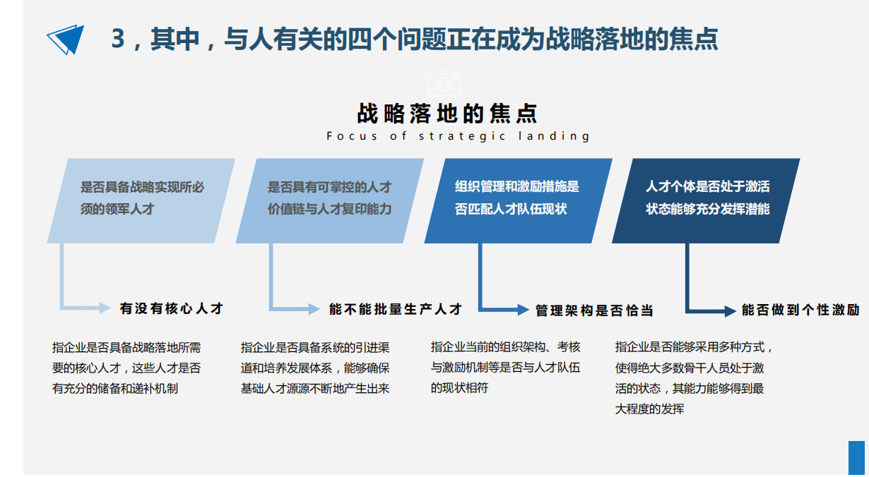 面對宏觀經(jīng)濟(jì)及環(huán)境的變化,每位企業(yè)家都要思考“政治局勢與全球化”、“經(jīng)濟(jì)結(jié)構(gòu)調(diào)整與機(jī)會風(fēng)口”、“消費(fèi)升級與客戶需求把握”、“科技與企業(yè)未來”、“新一代勞動者與人才選用育留”等諸多新的戰(zhàn)略命題。而“蓋洛普路徑理論”恰如其分地闡釋了“人才”對于企業(yè)經(jīng)營的終極價(jià)值。其中,有關(guān)于人的四個(gè)問題,正在成為戰(zhàn)略落地的焦點(diǎn)。