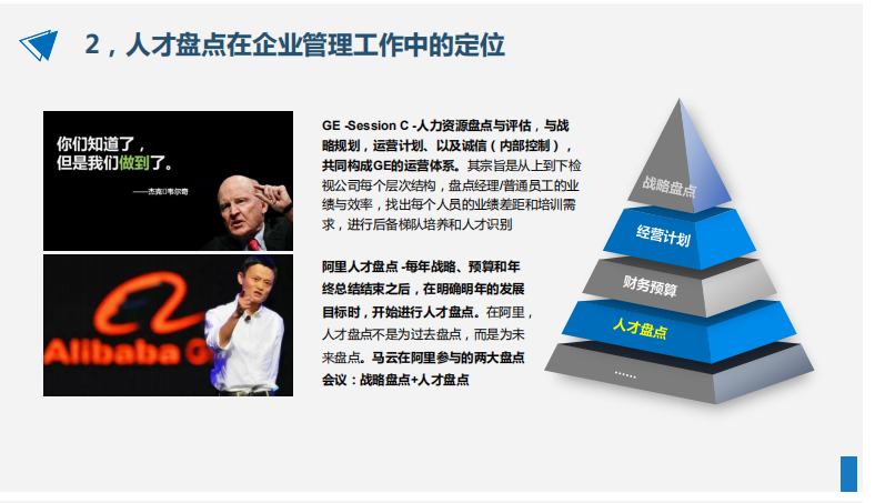 在GE、阿里等企業(yè),“人才盤點(diǎn)”作為與“戰(zhàn)略盤點(diǎn)”比肩而立的一項(xiàng)重要工作,獲得CEO的高度重視與深度參與。人才盤點(diǎn)之于企業(yè)的意義,在于它能夠幫助企業(yè)對人才資源進(jìn)行有效的識別、使用和儲備,促進(jìn)人才的戰(zhàn)略性配置;之于個(gè)體的意義,在于它能夠幫助員工個(gè)體認(rèn)識能力的優(yōu)劣,揚(yáng)長補(bǔ)短,發(fā)展提升。