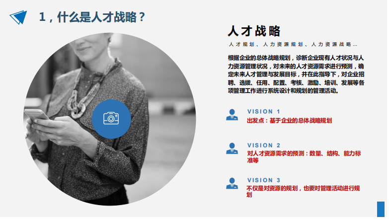 人才戰(zhàn)略,是根據(jù)企業(yè)的總體戰(zhàn)略規(guī)劃,診斷企業(yè)現(xiàn)有人才狀況與人力資源管理狀況,對未來的人才資源需求進(jìn)行預(yù)測,確定未來人才管理與發(fā)展目標(biāo),并在此指導(dǎo)下,對企業(yè)招聘、選拔、任用、配置、考核、激勵、培訓(xùn)、發(fā)展等各項(xiàng)管理工作進(jìn)行系統(tǒng)設(shè)計(jì)和規(guī)劃的管理活動。