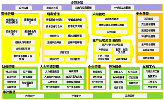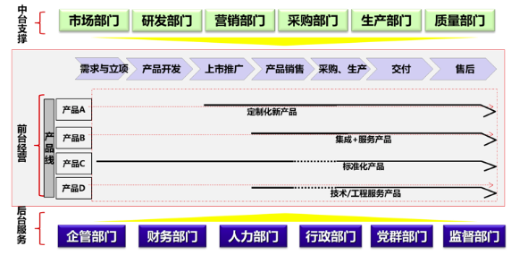 組織運作機制可以整體概括為:前臺經(jīng)營、中臺支撐、后臺服務(wù)。流程體系設(shè)計需要以組織架構(gòu)為基礎(chǔ)和前提,因此,項目組將通過行業(yè)最佳實踐、能源技術(shù)公司組織運作模式分析,與能源技術(shù)公司中高層進(jìn)行充分研討,進(jìn)一步明確組織架構(gòu)及運作模式。項目組初步認(rèn)為,能源技術(shù)公司需要建立以產(chǎn)品線為主線,中臺和后臺全力支撐產(chǎn)品,從需求立項、開發(fā)、上市推廣、銷售、采購生產(chǎn)、交付、售后的全生命周期組織運作機制,打破部門墻,建立矩陣式柔性組織體系,支撐流程的高效運轉(zhuǎn)。