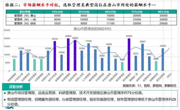 2、對標(biāo)外部崗位薪酬水平。通過對標(biāo)北上廣等一線城市、唐山市典型崗位各分位值的薪酬水平,運用對標(biāo)崗位的跟隨策略及領(lǐng)先策略,確定各崗位的薪酬水平中位值,確定各崗位的薪酬值,保證公司薪酬水平在市場上有一定的競爭性。
