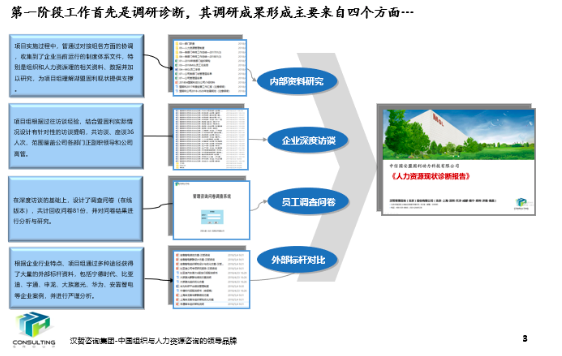 項(xiàng)目原計(jì)劃第一階段進(jìn)行戰(zhàn)略澄清,旨在通過調(diào)研、對標(biāo)與管理診斷,發(fā)現(xiàn)并剖析組織存在的根本問題,通過對戰(zhàn)略的梳理與澄清,明確未來的管理提升日程表,指明方向并明確優(yōu)先次序。實(shí)際實(shí)施過程中,客戶核心領(lǐng)導(dǎo)認(rèn)為新能源汽車行業(yè)政策的不確定性,公司戰(zhàn)略很難明確,因此項(xiàng)目組選擇了通過內(nèi)部資料研究、企業(yè)深度訪談、員工調(diào)查問卷、外部標(biāo)桿資料對比,政策研究等維度,對其戰(zhàn)略、組織、人力資源管理、組織文化等進(jìn)行全面診斷,發(fā)現(xiàn)問題并提出改進(jìn)的思路。