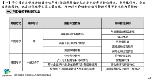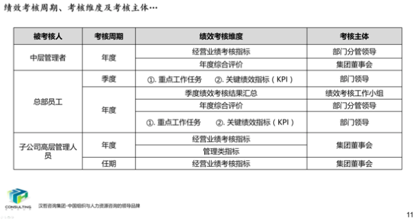 1、優(yōu)化集團和子公司經(jīng)營業(yè)績考核辦法。根據(jù)集團戰(zhàn)略目標和子公司的功能定位、業(yè)務特點,集團總部實行年度考核,所屬子公司實行年度考核與任期考核相結合的方式,遵循戰(zhàn)略導向、團隊導向、客觀公正、分類考核的原則,制定各部門考核指標、考核程序、考核計分辦法,形成經(jīng)營業(yè)績考核辦法,提高激勵作用,為實現(xiàn)集團戰(zhàn)略目標夯實基礎。