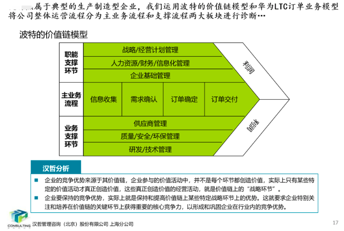 項(xiàng)目組針對(duì)公司在生產(chǎn)運(yùn)營中凸顯的問題,應(yīng)用波特的價(jià)值鏈模型與華為的LTC訂單業(yè)務(wù)模型對(duì)公司各項(xiàng)業(yè)務(wù)活動(dòng)進(jìn)行了分析和優(yōu)化,提出主業(yè)務(wù)流程框架及業(yè)務(wù)與支撐流程清單。