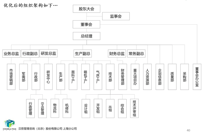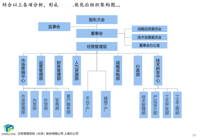 項(xiàng)目組從戰(zhàn)略意圖、價(jià)值鏈流程、組織功能分析、外部借鑒四個(gè)維度對(duì)公司的組織體系進(jìn)行了分析與優(yōu)化,提出了公司當(dāng)前的組織架構(gòu)優(yōu)化方案以及中長期組織架構(gòu)優(yōu)化與調(diào)整思路。