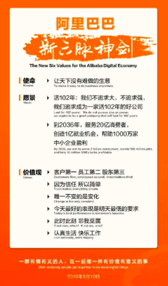 馬云說:“可能全世界很少能找到這樣一家公司,花這么多的時間對價值觀進(jìn)行討論。”只為尋找與阿里一起走向未來的“同路人”。過去 20 年,阿里因為價值觀而與眾不同。未來 20 年,阿里應(yīng)該、也必須因為堅持價值觀而與眾不同。接班人張勇說,"我們花這么大的代價、這么大的投入去做這件事情。最重要的目的是尋找我們的同路人,走向未來、走向 102 年,走好未來 5 年、10 年、20 年的同路人。"從"六脈神劍"到"新六脈神劍",是因為使命、愿景、價值觀就是阿里巴巴的DNA,過去如此,面向未來,更是如此。