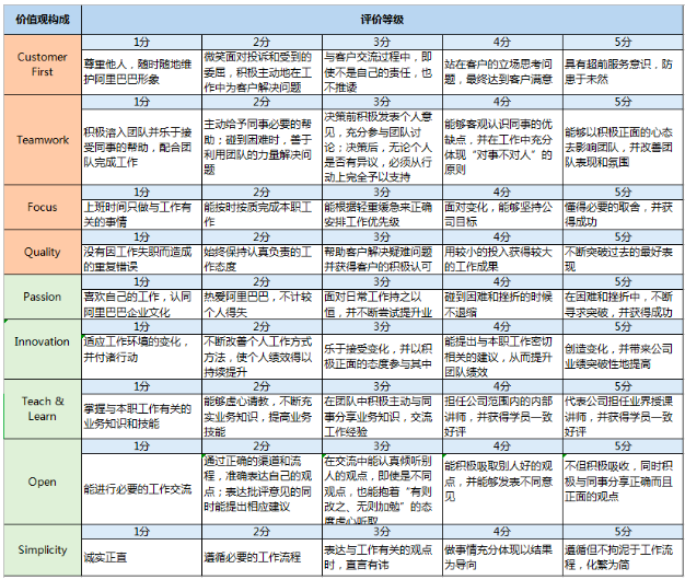 據(jù)阿里前HR資深總監(jiān)陸凱薇介紹,“價值觀內(nèi)容不變,打分變成ABC,與業(yè)績形成兩個序列。如業(yè)績?yōu)?.75價值觀為A,合起來為“3.75A”,3.75只代表業(yè)務(wù)結(jié)果,ABC代表員工的價值觀的理解和踐行能力。