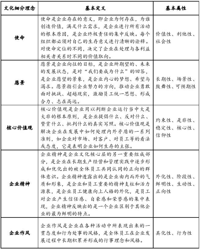 文化細分理念要素歸集是指對企業(yè)使命、愿景、核心價值觀、企業(yè)精神等核心文化理念所涉及文化要素進行歸集。在實際操作中,企業(yè)文化創(chuàng)建團隊往往會出現(xiàn)對文化核心理念的定義認識不清、屬性認知不清的情況。因此,這個階段,首先要對各細分文化理念的基本定義和屬性進行清晰的認知,這是進行要素歸集的重要前提條件。此基礎上,對第二步篩選的文化要素與使命、愿景、核心價值觀、企業(yè)精神等核心文化理念進行初步對應和劃歸,明確哪些要素要在使命中予以體現(xiàn),哪些要在愿景中予以體現(xiàn)、哪些要在核心價值觀中予以體現(xiàn),等等。從而為后續(xù)細分文化理念提煉提供支撐。