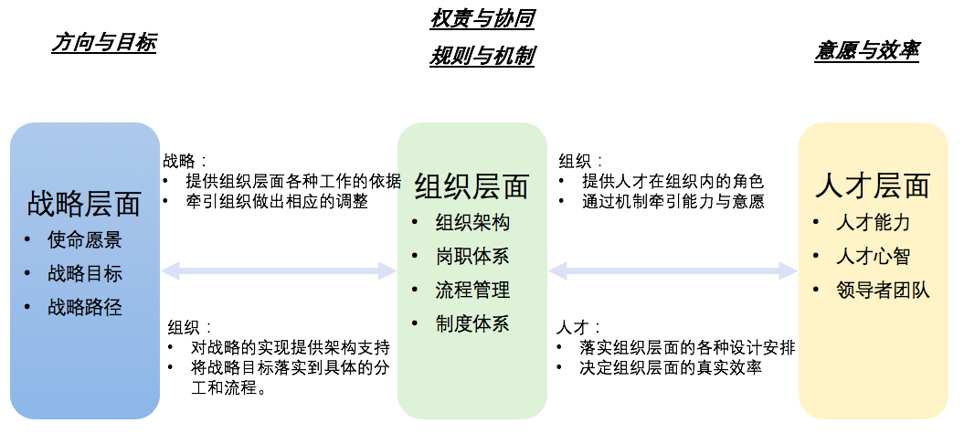 從上圖可見,組織層面的各種設(shè)計,組織架構(gòu)和管控,流程設(shè)計、各種制度,也包含人力資源相關(guān)的考核、薪酬、干部管理、勞動關(guān)系與用工、招聘配置等等的具體規(guī)則,既承接了戰(zhàn)略目標,為具體的戰(zhàn)略實現(xiàn)服務(wù),也需要隨著戰(zhàn)略的調(diào)整而調(diào)整,同時,組織層面的各種設(shè)計,也決定了對人才的具體角色要求,角色要求既代表著對人才標準的要求,同時也通過各種流程制度形成機制牽引著人才能力的發(fā)揮和心智的改善,當然,人才層面的各種要素的表現(xiàn)水平也直接影響者組織層面各種設(shè)計的實際運行效率,并且有可能倒逼組織層面進行相應(yīng)的調(diào)整,比如人才能力不能支持組織層面的設(shè)計,或組織層面的設(shè)計無法充分發(fā)揮人才的能力時。所以人才管理體系設(shè)計的重點就在于如何在組織層面通過制度設(shè)計,配合相應(yīng)的工具方法,最終在人才層面達到想要的結(jié)果,從而將戰(zhàn)略層面與人才層銜接起來。