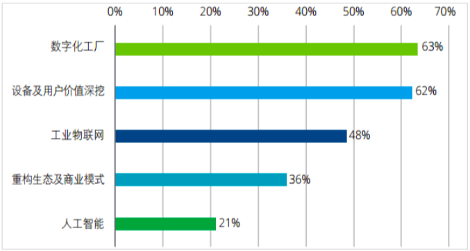 當(dāng)前,中國(guó)工業(yè)企業(yè)智能制造五大部署重點(diǎn)依次為:數(shù)字化工廠、設(shè)備及用戶價(jià)值深挖、工業(yè)物聯(lián)網(wǎng)、重構(gòu)商業(yè)模式以及人工智能。