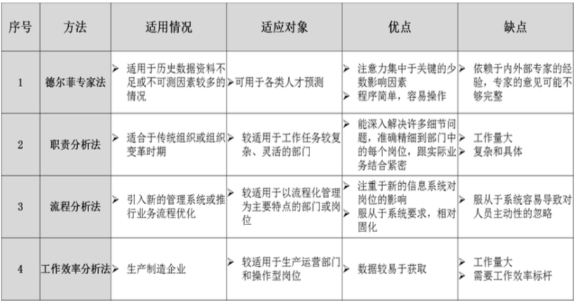 定編的方法也有很多,比如德爾菲專家法、職責(zé)分析法、流程分析法、工作效率分析法等。各自有其優(yōu)缺點。具體如下: