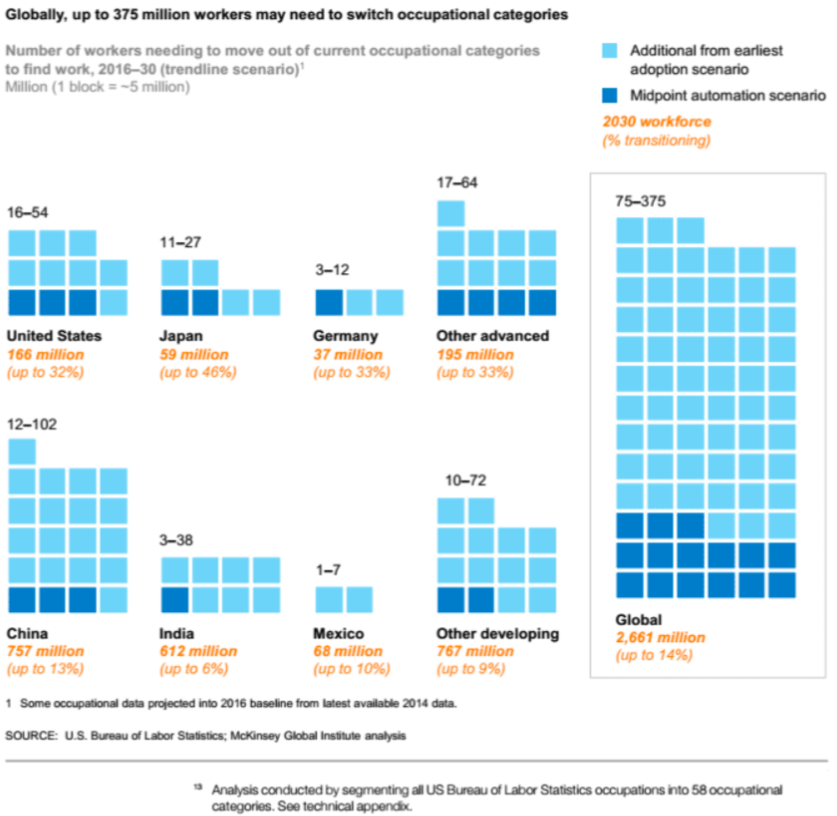 但是實(shí)際情況卻不能把人才冗余問(wèn)題一棍子打死,首先,冗余是絕對(duì)的,沒(méi)有不存在冗余的企業(yè),用現(xiàn)在比較流行的話說(shuō),企業(yè)發(fā)展是克服“熵增”的過(guò)程,熵是永遠(yuǎn)存在的,冗余既是一種熵,因此應(yīng)對(duì)人才冗余,重要的是將其控制在合理的范圍內(nèi),比如人力資源結(jié)構(gòu)上的冗余,對(duì)于企業(yè)應(yīng)對(duì)突發(fā)狀況,如大規(guī)模人才流失,或解決短時(shí)間市場(chǎng)擴(kuò)展問(wèn)題是能起到一定作用的;其次,企業(yè)的發(fā)展本身就是一個(gè)“均衡—不均衡—均衡”的過(guò)程(彭羅斯的企業(yè)成長(zhǎng)理論),尤其是在VUCA時(shí)代,需要快速應(yīng)對(duì)的變化有很多,如何在不均衡中尋找動(dòng)力成為關(guān)鍵問(wèn)題,因此而帶來(lái)的人才冗余也是必然要接受的,這一點(diǎn),不僅對(duì)于企業(yè)適用,從處于變革期的社會(huì)也同樣如此,如麥肯錫2017年1月的“JOBS LOST, JOBS GAINED: WORKFORCE TRANSITIONS”報(bào)告所顯示的,隨著互聯(lián)網(wǎng)及數(shù)字技術(shù)的發(fā)展,預(yù)計(jì)2030年,全球有3.75億人面臨轉(zhuǎn)崗問(wèn)題,如下圖所示,列舉了美國(guó)、日本、德國(guó)、中國(guó)、印度、墨西哥等國(guó)家的面臨的轉(zhuǎn)崗人數(shù),假如我們把不同的國(guó)家比作不同行業(yè)不同發(fā)展階段的企業(yè),那即可將這種轉(zhuǎn)崗的趨勢(shì)看作不同行業(yè)生態(tài)下,各企業(yè)所面臨的剛性的人才冗余問(wèn)題。