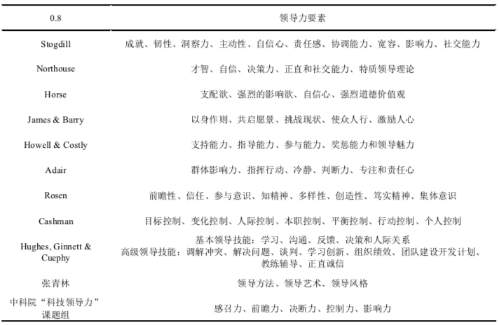 筆者首先對中層領(lǐng)導(dǎo)人員相關(guān)的國內(nèi)外文獻(xiàn)進(jìn)行研究,選取具有代表性的研究文獻(xiàn),從任職資格、勝任素質(zhì)模型、領(lǐng)導(dǎo)力模型等相關(guān)研究中對人才標(biāo)準(zhǔn)的素質(zhì)項進(jìn)行了歸納。這些研究從領(lǐng)導(dǎo)干部的個性、態(tài)度、動機(jī)、特質(zhì)等多個方面對人才標(biāo)準(zhǔn)進(jìn)行了探索和分析。
