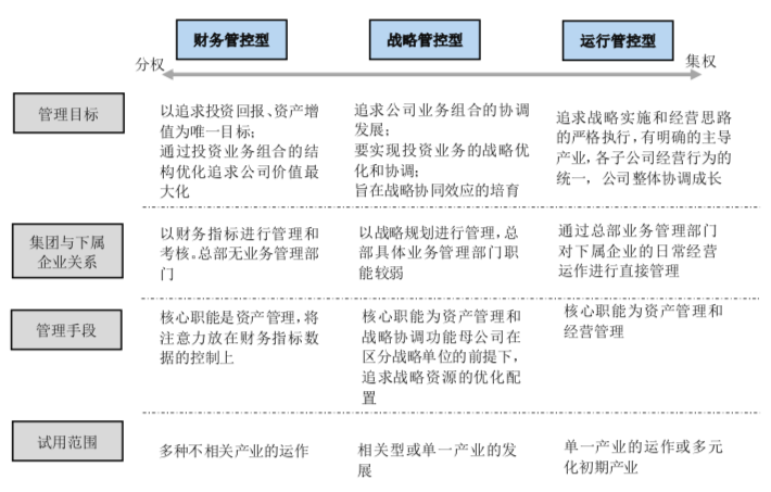 明確企業(yè)的戰(zhàn)略后,依據(jù)業(yè)務(wù)發(fā)展定位選在合適的管控模式,通常來說集團(tuán)對下屬單位的管控模式依據(jù)集權(quán)程度分為財務(wù)管控型、戰(zhàn)略管控型和運(yùn)行管控型三種模式。而在實(shí)際操作中,根據(jù)業(yè)務(wù)發(fā)展的不同特點(diǎn),又衍生出戰(zhàn)略財務(wù)型管控和戰(zhàn)略運(yùn)行型管控兩種模式。