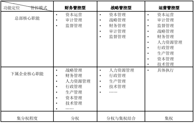 三種集團(tuán)管控模式體現(xiàn)了對總部功能的不同定位: