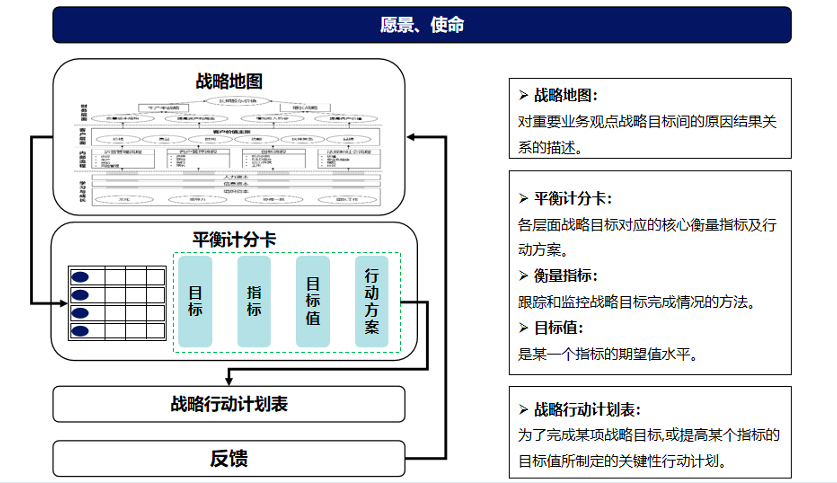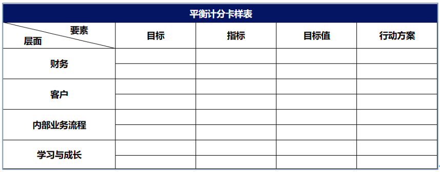 “卡”即是平衡計分卡,平衡計分卡用來衡量企業(yè)的戰(zhàn)略,通過為戰(zhàn)略地圖中的戰(zhàn)略目標(biāo)找到衡量的指標(biāo),能更有效的監(jiān)控戰(zhàn)略實施的情況。