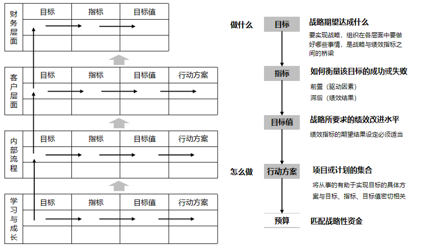 每個層面下結(jié)構(gòu)化模式:戰(zhàn)略目標(biāo)、評價指標(biāo)、目標(biāo)值、行動方案。