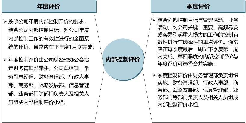 項目組同公司領(lǐng)導(dǎo)、主要業(yè)務(wù)部門對內(nèi)控評價組織機(jī)構(gòu)、關(guān)注內(nèi)容、評價基本要求與評價方法、評價程序、評價工作的監(jiān)督與考核及評價所需相關(guān)表單進(jìn)行研討,最終確定公司季度評價與年度評價相結(jié)合的評價方式。