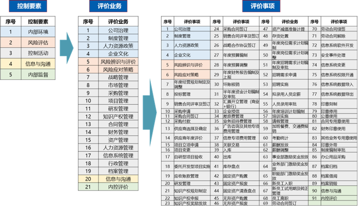 圍繞公司業(yè)務(wù)建立“內(nèi)控評價指標(biāo)庫”作為年度/季度評價時評價內(nèi)容選取的依據(jù)。評價庫基于公司核心業(yè)務(wù)模塊建立,并圍繞核心模塊,對該核心模塊涉及的重要業(yè)務(wù)活動進(jìn)行細(xì)化。在此基礎(chǔ)上,對評價業(yè)務(wù)活動所應(yīng)參考的制度或流程進(jìn)行明確,從而為實施相關(guān)業(yè)務(wù)活動評價提供具體依據(jù)。