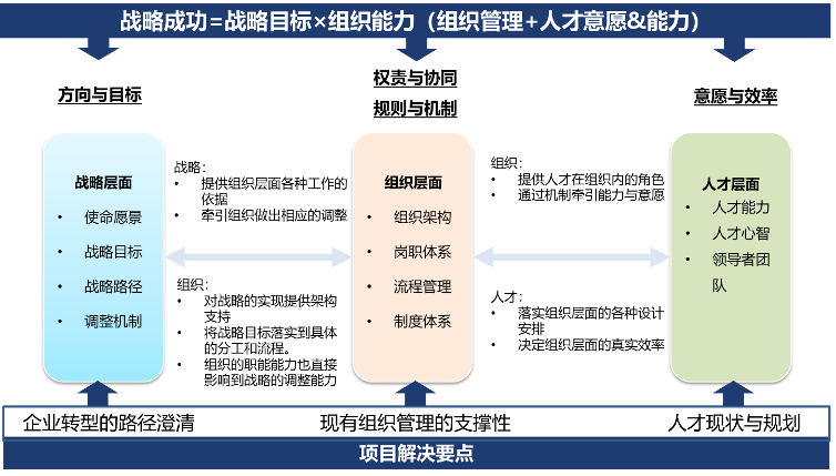 為系統(tǒng)的解決該公司的管理問題,漢哲咨詢從戰(zhàn)略成功的角度出發(fā)分別明確了組織層面與人才層面的項目著力點