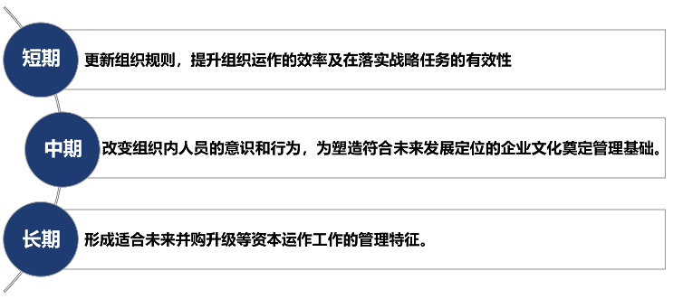 咨詢項目不是一蹴而就的,真實能夠改變企業(yè)需要一個中長期的過程,由企業(yè)進行內化, 為此漢哲咨詢提出了3年服務期,并針對此項目提出了短期、中期、長期的落地目標: