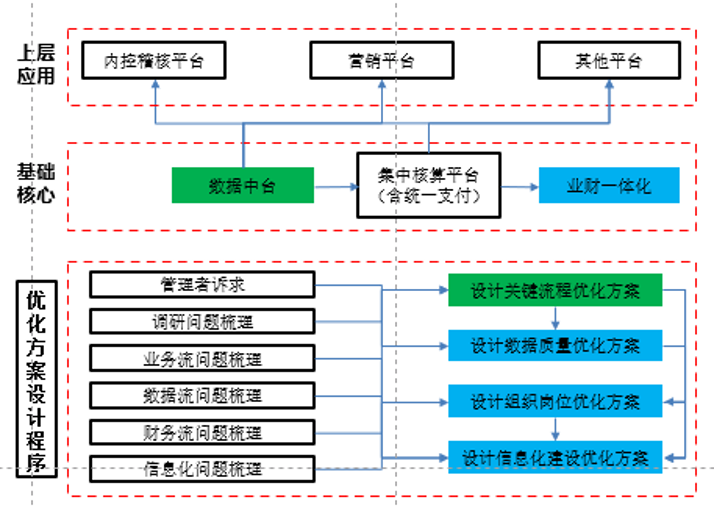 交叉式式分階段實(shí)施,以業(yè)財(cái)一體化及關(guān)鍵流程優(yōu)化為主線,完成整體優(yōu)化方案設(shè)計(jì)。