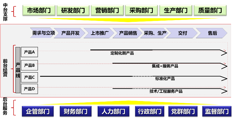 組織運(yùn)作機(jī)制可以整體概括為:前臺(tái)經(jīng)營、中臺(tái)支撐、后臺(tái)服務(wù)。流程體系設(shè)計(jì)需要以組織架構(gòu)為基礎(chǔ)和前提,因此,項(xiàng)目組將通過行業(yè)最佳實(shí)踐、能源技術(shù)公司組織運(yùn)作模式分析,與能源技術(shù)公司中高層進(jìn)行充分研討,進(jìn)一步明確組織架構(gòu)及運(yùn)作模式。項(xiàng)目組初步認(rèn)為,能源技術(shù)公司需要建立以產(chǎn)品線為主線,中臺(tái)和后臺(tái)全力支撐產(chǎn)品,從需求立項(xiàng)、開發(fā)、上市推廣、銷售、采購生產(chǎn)、交付、售后的全生命周期組織運(yùn)作機(jī)制,打破部門墻,建立矩陣式柔性組織體系,支撐流程的高效運(yùn)轉(zhuǎn)。