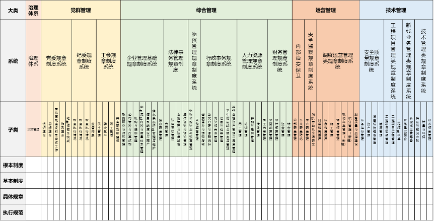 梳理總部及所屬單位的根本制度、基本制度,確保兩級(jí)根本制度、基本制度上下銜接貫通。下圖為地鐵公司的兩級(jí)制度體系框架: