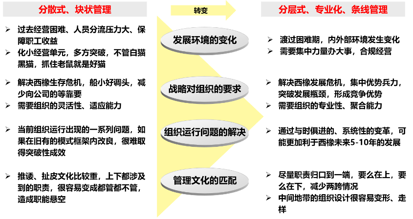 第一,建立了兩級(jí)管控的清晰管理層級(jí),原機(jī)構(gòu)設(shè)置從30多個(gè)部門整合優(yōu)化為20多個(gè)部門,總部部門從20多個(gè)優(yōu)化整合為10多個(gè)部門,大量的部門間職責(zé)交叉、扯皮問題解決。