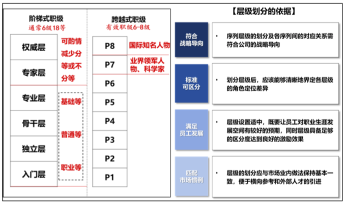 當(dāng)然,除參考市場(chǎng)經(jīng)驗(yàn)外,企業(yè)還需要考慮內(nèi)部實(shí)際情況,尤其是各序列實(shí)際情況來(lái)進(jìn)行層級(jí)劃分。專業(yè)壁壘、戰(zhàn)略重要性差異較大的序列在層級(jí)劃分上也會(huì)有一定區(qū)別。