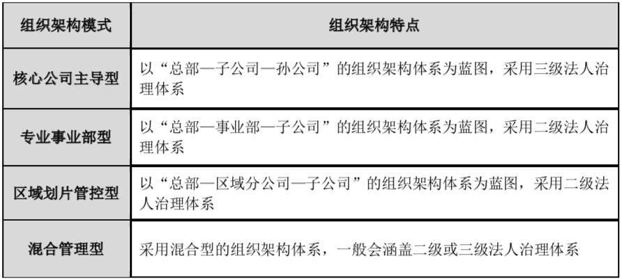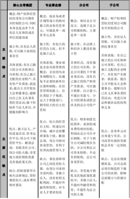 該組織架構(gòu)模式兼有子集團、子公司、事業(yè)部等多種不同的二級企業(yè)組織形式,具有較強的兼容性與靈活性,適合對下屬業(yè)務(wù)進行差異化管理。
