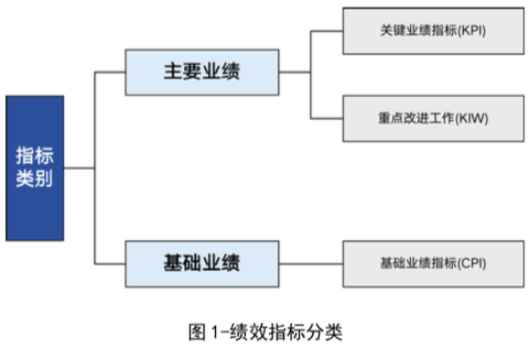 不同考核方式績效指標分類不同。本文的績效指標是以關鍵業(yè)績指標(KPI,Key Performance Indicator )、重點改進工作(KIW,Key Improvement Works)和基礎業(yè)績指標(CPI,Common Performance Indicator)三類指標構成的指標體系。指標覆蓋了了企業(yè)的經(jīng)營類、管理類、專業(yè)類、協(xié)調類等工作,可以實現(xiàn)對企業(yè)與員工績效系統(tǒng)性考核與評價。見圖1-績效指標分類。