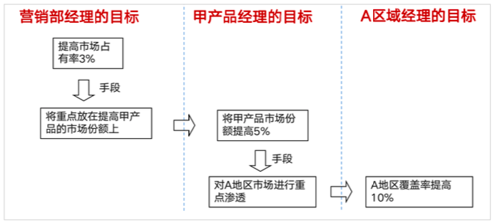 上下級目標具有較強的承接關系。下級目標是上級目標實現(xiàn)的必要條件(不是充分條件),下級目標是對上級目標的分解(是上級目標實現(xiàn)的手段),下級目標不是對上級目標的平均分配。以某公司營銷部不同崗位員工市場占有率指標為例,詳見如下: