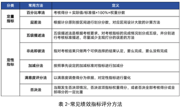 績效考核指標一般分為定性指標與定量指標兩類,不同指標的評分規(guī)則與評分方法不同,詳見表2-常見績效指標評分方法。