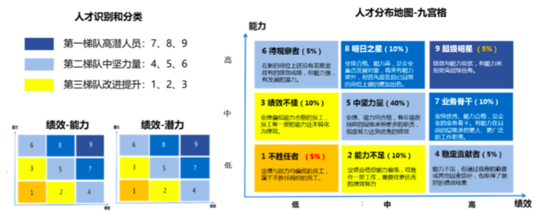 人才盤點(diǎn)的重要輸出成果人才分布地圖-九宮格,通過績效與能力、能力與潛力兩個維度,可以把人員劃分到九個不同的位置中,在后續(xù)的人才管理中會針對不同類型人才給予不同的管理策略,從而更精準(zhǔn)、有效地配置資源。