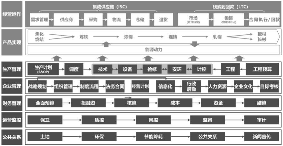 三、進(jìn)行二級流程梳理分析?;趦深悇e下的7大一級流程(L1),按業(yè)務(wù)運(yùn)行的基本邏輯梳理細(xì)化形成二級流程組(L2),二級流程模塊是評估組織運(yùn)行,進(jìn)行組織架構(gòu)調(diào)整的重要依據(jù),是構(gòu)建橫到邊、縱到底組織結(jié)構(gòu)的可靠依據(jù),是確保今后組織架構(gòu)有效運(yùn)行的重要支撐,也是未來繪制操作的流程體系的坐標(biāo)。經(jīng)過梳理,該鋼企的二級流程圖如下: