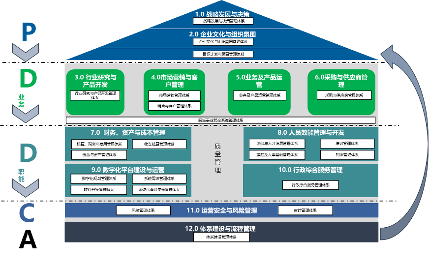 該企業(yè)管理體系梳理思路以“PDCA循環(huán)”理論為依據,建立了體系層面的動態(tài)持續(xù)提升機制。其中,戰(zhàn)略與文化為引領,屬于規(guī)劃層;目標計劃預算活動為銜接;業(yè)務活動與支持類活動為執(zhí)行層,風控與審計職能模塊為監(jiān)督檢查層,體系建設與流程管理為改善提升層。體系建設規(guī)劃以支撐企業(yè)經營管理為目標,以持續(xù)提升改善為要求。