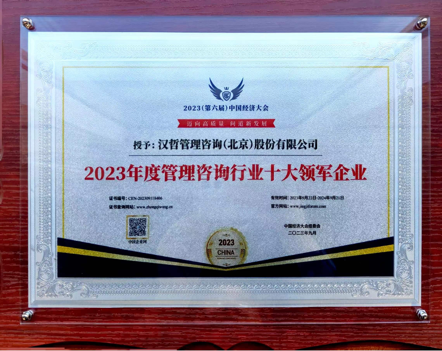作為中國(guó)管理咨詢行業(yè)的領(lǐng)軍企業(yè)之一,漢哲管理咨詢(北京)股份有限公司受邀參與了本次大會(huì)并榮獲“2023年度管理咨詢行業(yè)十大領(lǐng)軍企業(yè)”稱號(hào)。