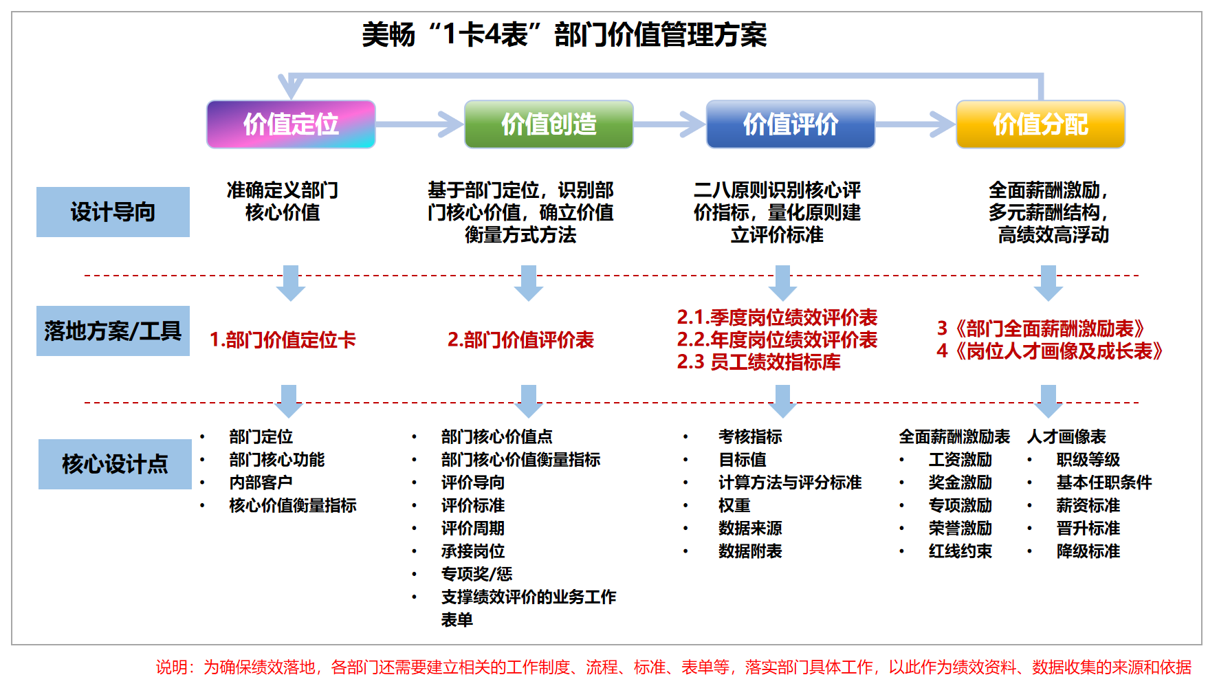 1、設(shè)計開發(fā)《部門價值定位卡》《部門價值評價表》《部門績效考核表》解決對部門價值的分析和梳理,提煉形成核心的、可量化的、可衡量的部門價值評價方案。